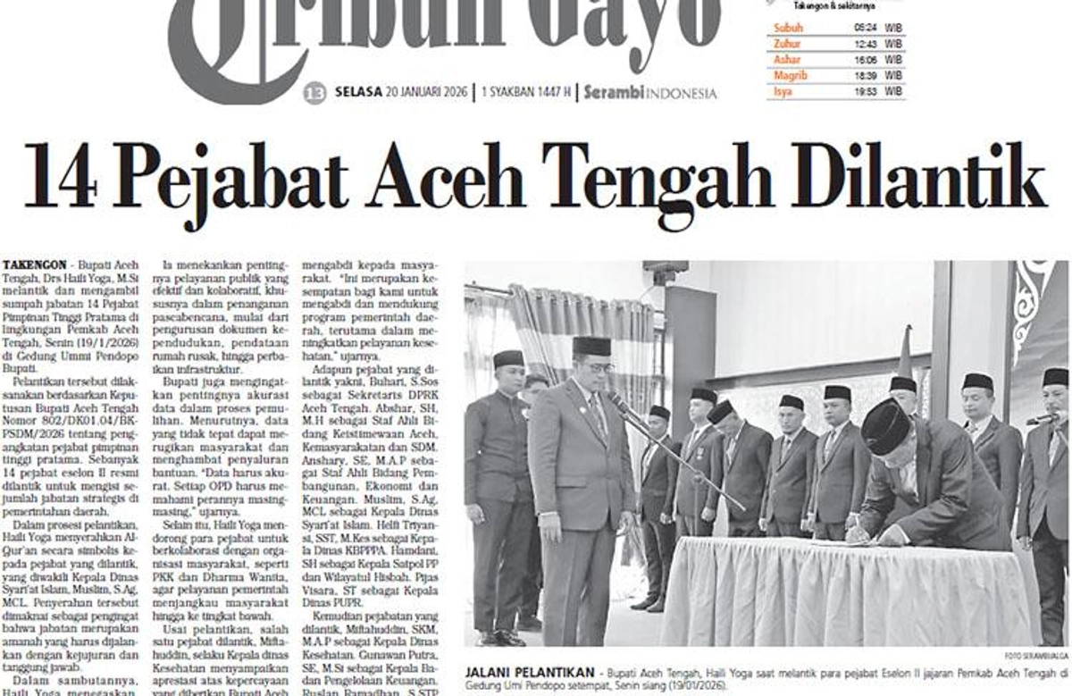 Bupati Aceh Tengah, Drs Haili Yoga, M.Si, melantik 14 pejabat pimpinan tinggi pratama di lingkungan Pemkab Aceh Tengah. Pelantikan ini bertujuan untuk mengisi jabatan strategis dalam pemerintahan daerah dan mempercepat pemulihan pasca bencana.