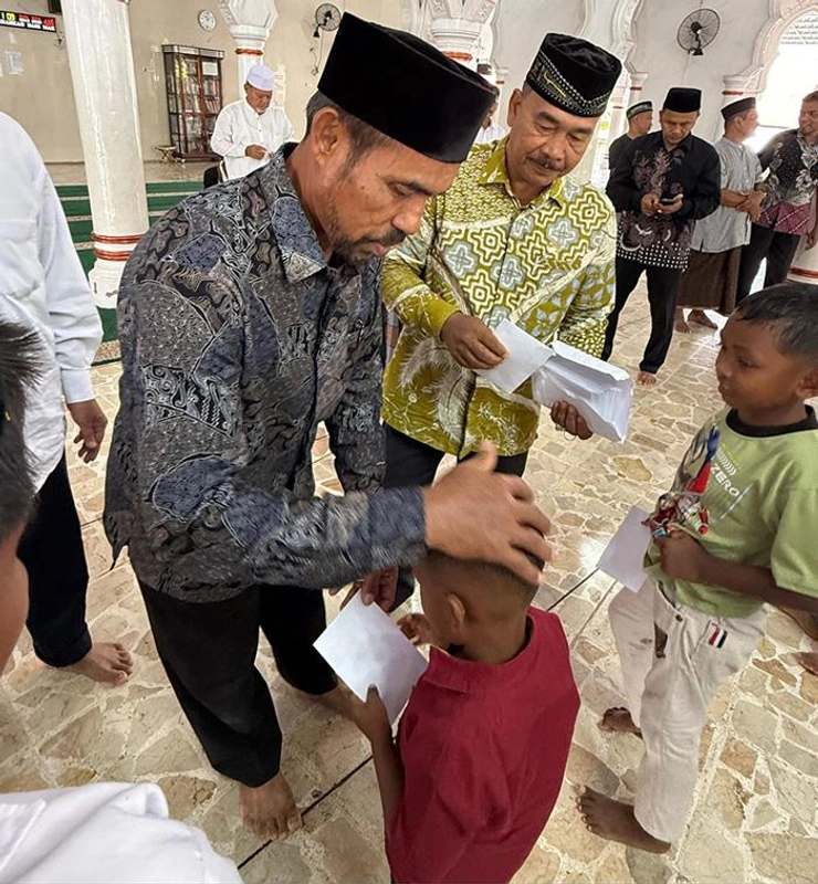 Suasana penyerahan santunan bagi 223 anak yatim piatu dari tujuh kemukiman dan 49 desa di Kecamatan Sakti berlangsung khidmat pada 21 Ramadhan 1447 H atau 11 Maret 2026. Acara ini berlangsung di Masjid Istiqamah Kota Bakti dan menjadi agenda sosial keagamaan yang rutin dilaksanakan masyarakat setempat setiap bulan suci Ramadhan.