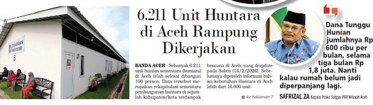 Sebanyak 6.211 unit hunian sementara (huntara) di Aceh telah selesai dibangun 100 persen. Data tersebut merupakan rekapitulasi sementara pembangunan huntara di sejumlah kabupaten/kota terdampak bencana di Aceh, yang diupdate pada Sabtu (14/2/2026). Sebelumnya diperoleh informasi bahwa kebutuhan Huntara di Aceh lebih dari 16.000 unit.