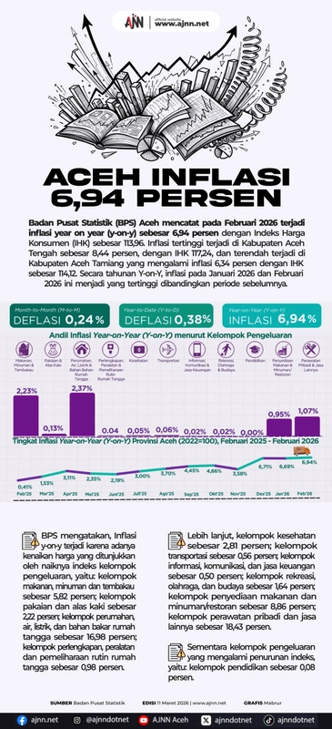 Inflasi di Aceh mencapai 6,94 persen, meningkatkan beban hidup warga. Kenaikan harga barang kebutuhan pokok menjadi penyebab utama inflasi yang dirasakan oleh masyarakat, terutama kelompok menengah ke bawah.