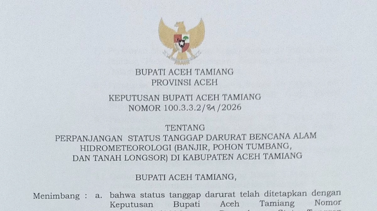 Pemerintah Kabupaten Aceh Tamiang memperpanjang status tanggap darurat bencana hingga 3 Februari 2026. Keputusan ini dituangkan dalam Surat Keputusan Bupati Aceh Tamiang Nomor 100.3.3.2/84/2026 dan ditandatangani oleh Bupati Aceh Tamiang, Armia Pahmi. Status tanggap darurat ini berlaku untuk penanganan bencana alam hidrometeorologi seperti banjir, pohon tumbang, dan tanah longsor.