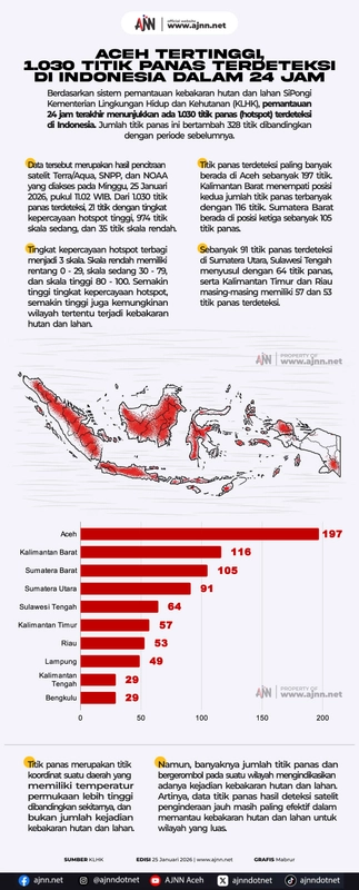 Aceh mencatat jumlah titik panas tertinggi di Indonesia dengan 1.030 titik dalam 24 jam terakhir. Data ini menunjukkan peningkatan signifikan yang berpotensi meningkatkan risiko kebakaran hutan dan lahan, serta dampak buruk bagi kesehatan masyarakat.