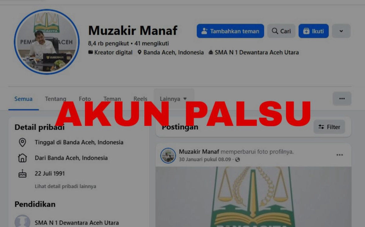 Pemerintah Aceh mengimbau masyarakat untuk meningkatkan kewaspadaan terhadap beredarnya akun Facebook palsu yang mencatut nama Gubernur Aceh, Muzakir Manaf, atau yang akrab disapa Mualem. Akun dengan nama “Muzakir Manaf” tersebut diketahui menyebarkan informasi bohong terkait penyaluran bantuan kepada masyarakat melalui pesan pribadi di media sosial. Modus tersebut diduga kuat bertujuan untuk menipu warga dengan meminta pemenuhan sejumlah persyaratan tertentu.