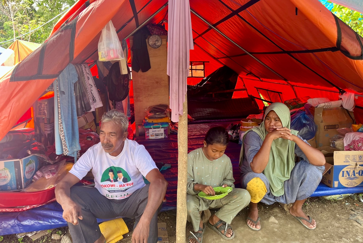 Kondisi di tenda pengungsian jauh dari ideal. Tenda berwarna oranye dengan atap terpal biru menjadi ruang hidup mereka, menahan panas di siang hari dan dingin di malam hari. Barang-barang bantuan seperti kardus logistik, pakaian, selimut, dan peralatan rumah tangga tertata seadanya. Alas tidur tipis digelar di atas tanah, menggantikan dinding rumah yang dulu melindungi.