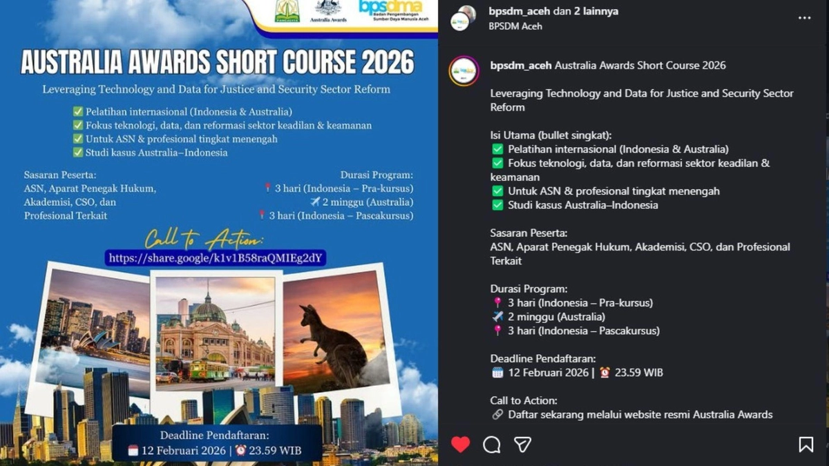 Program Australia Awards Short Course 2026 kini dibuka untuk aparatur negara dan profesional Indonesia, termasuk dari Aceh. Program ini mengusung tema "Leveraging Technology and Data for Justice and Security Sector Reform", yang bertujuan untuk meningkatkan kapasitas peserta dalam penggunaan teknologi dan data untuk mendukung reformasi sektor keadilan dan keamanan.