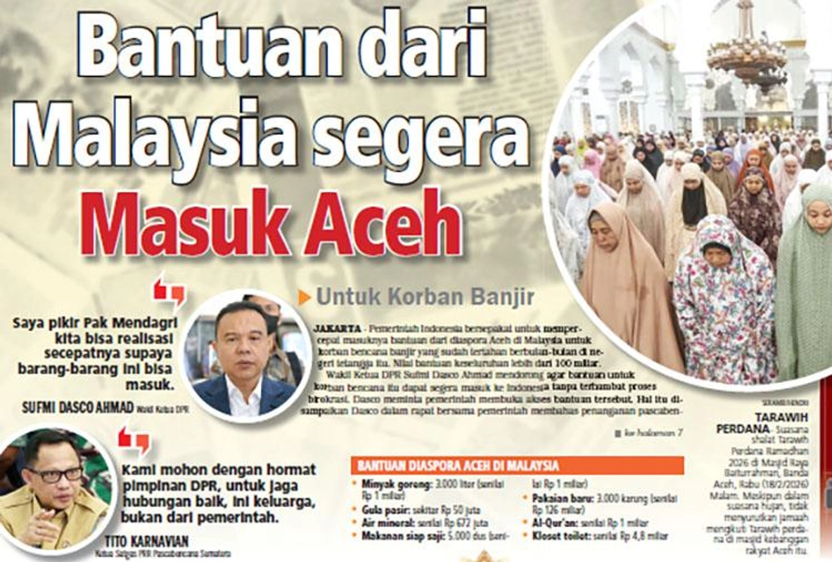 Bantuan dari diaspora Aceh di Malaysia senilai lebih dari 100 miliar rupiah akan segera masuk ke Aceh untuk korban banjir. Bantuan ini mencakup berbagai kebutuhan pokok seperti minyak goreng, gula pasir, dan pakaian baru. Proses pengiriman sempat tertahan di Port Klang, Malaysia, namun kini sedang diupayakan percepatan perizinan oleh pemerintah Indonesia. Bantuan ini diharapkan dapat membantu masyarakat Aceh menjelang bulan puasa dan Hari Raya Lebaran.