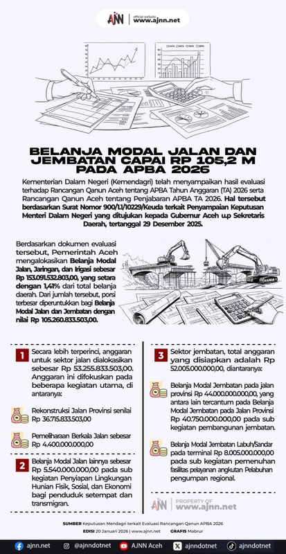 Pemerintah Aceh mengalokasikan Rp 105,2 miliar untuk belanja modal jalan dan jembatan dalam Anggaran Pendapatan dan Belanja Aceh (APBA) 2026. Anggaran ini mencerminkan prioritas pemerintah daerah dalam memperbaiki dan membangun infrastruktur yang vital bagi masyarakat Aceh.