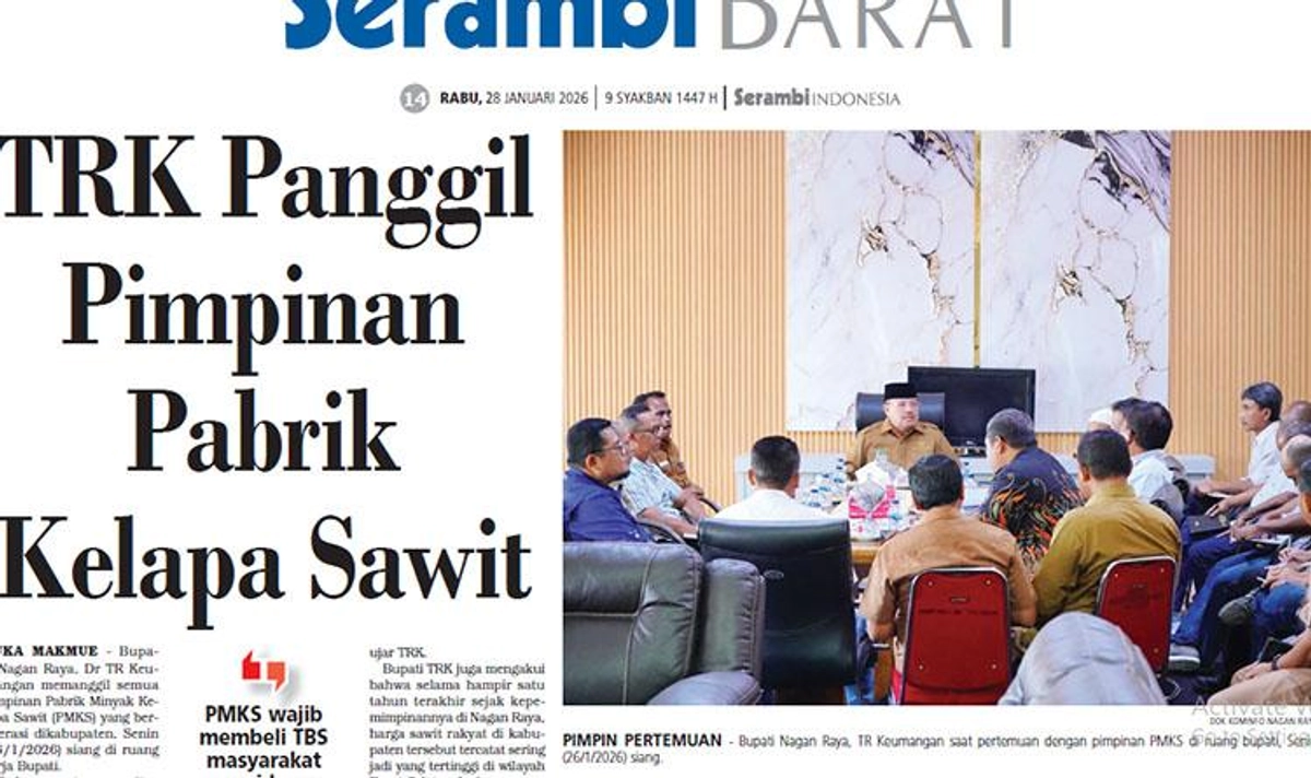 Bupati Nagan Raya, Dr TR Keumangan, memanggil semua pimpinan Pabrik Minyak Kelapa Sawit (PMKS) yang beroperasi di kabupaten, Senin (26/1/2026) siang di ruang kerja Bupati. Dalam pertemuan itu, TRK, sapaan bupati meminta PMKS agar wajib membeli tandan buah segar (TBS) milik masyarakat sesuai dengan harga yang telah ditetapkan oleh pemerintah.