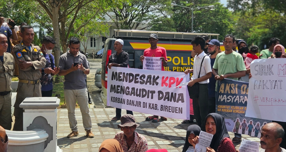 Ratusan warga korban banjir di Kabupaten Bireuen menggelar aksi unjuk rasa di Kantor Bupati Bireuen. Mereka menuntut kepastian hunian sementara (huntara) serta pencairan dana tunggu hunian (DTH) yang hingga kini belum diterima sebagian korban. Aksi ini diwarnai orasi para pengungsi yang menyampaikan tuntutan dengan penuh emosi.
