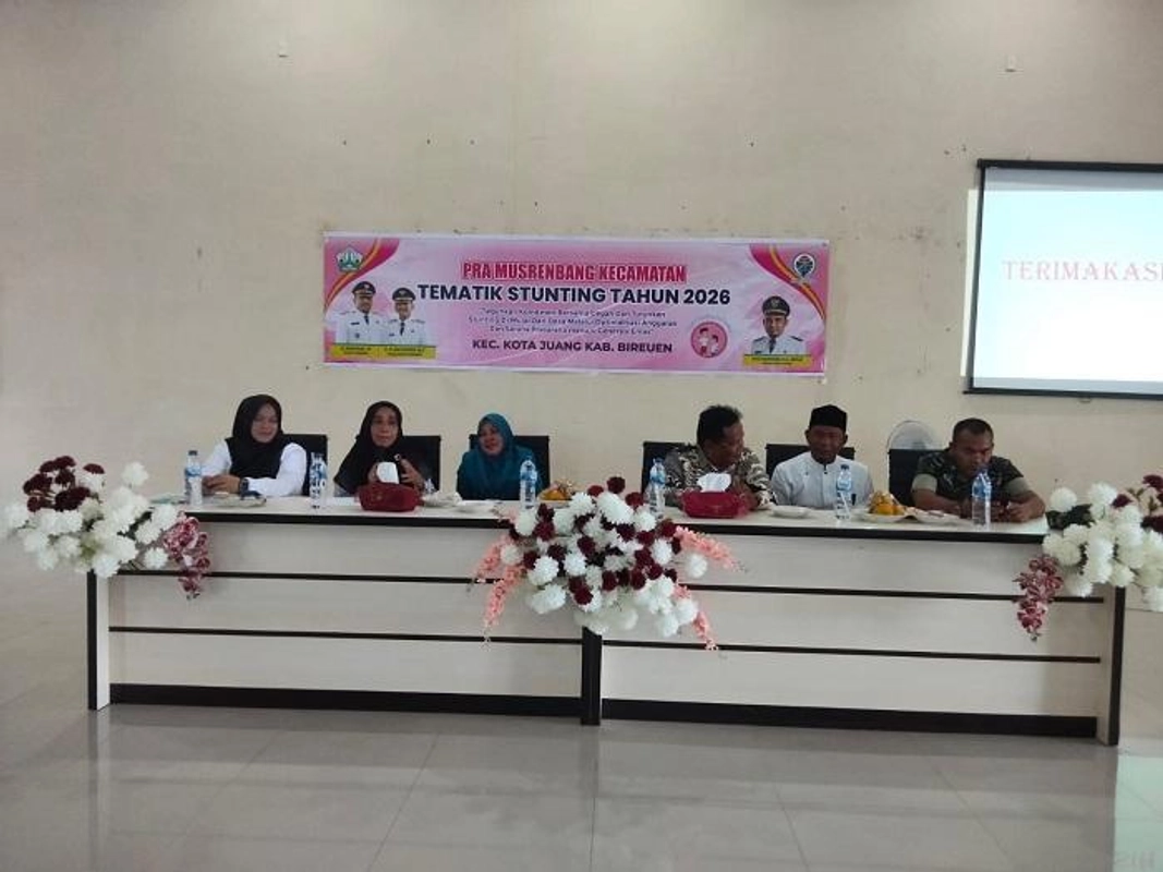 Musyawarah Perencanaan Pembangunan (Musrenbang) tingkat Kecamatan Kota Juang, Kabupaten Bireuen, diawali dengan kegiatan Pra Musrenbang Tematik Stunting Tahun 2026 yang digelar pada Jumat (6/2/2026). Pertemuan ini menjadi langkah awal untuk menyatukan arah kebijakan lintas desa dalam upaya pencegahan dan penurunan angka stunting di wilayah tersebut.