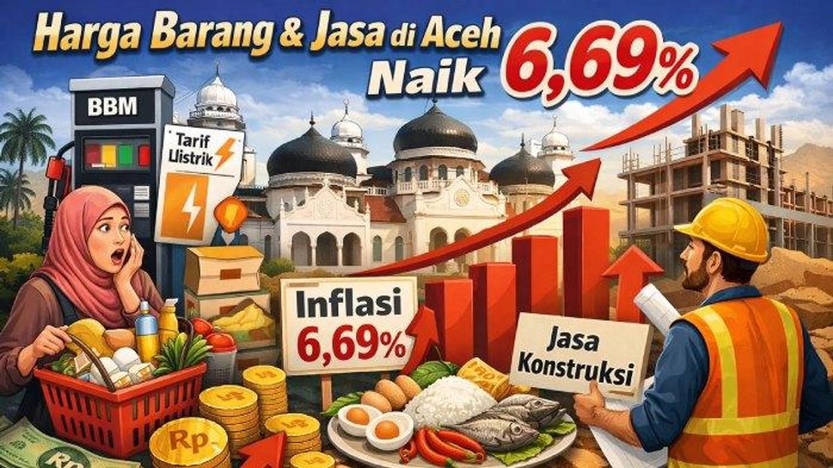 Harga barang dan jasa di Aceh naik 6,69 persen di awal 2026, menurut BPS Aceh. Inflasi tahunan didorong oleh kenaikan harga tarif listrik, emas perhiasan, beras, nasi dengan lauk, dan sigaret kretek mesin (SKM). Sementara itu, beberapa komoditas seperti cabai merah, kentang, dan biaya sekolah memberikan deflasi.