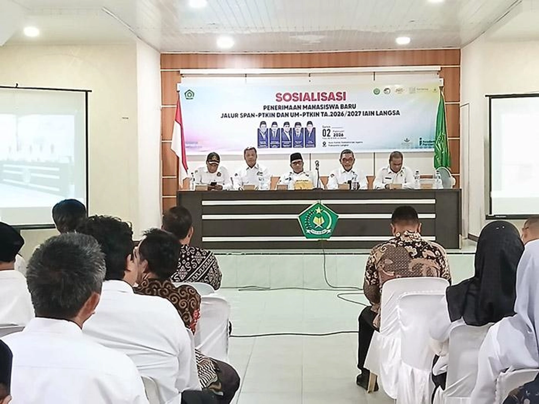 Institut Agama Islam Negeri (IAIN) Langsa melakukan sosialisasi Penerimaan Mahasiswa Baru (PMB) di Kabupaten Langkat, Sumatera Utara, Senin (2/2/2026). Acara ini diikuti oleh 60 Kepala Madrasah Aliyah dan berlangsung di aula Kantor Kementerian Agama Kabupaten Langkat.