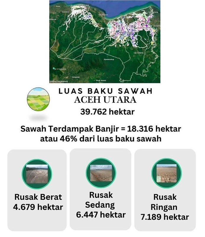 Kerusakan sawah terbagi menjadi tiga kategori: rusak berat (4.679 hektar), rusak sedang (6.447 hektar), dan rusak ringan (7.189 hektar). Kepala Dinas Pertanian Pangan Aceh Utara, Erwandi, menjelaskan bahwa sawah yang terdampak sedimentasi masih dapat ditanami, tetapi kendala fisik lahan menjadi pembatas utama. Pemerintah daerah perlu segera menyusun langkah strategis untuk pemulihan lahan pertanian dan membantu petani agar dapat kembali berproduksi secara normal.