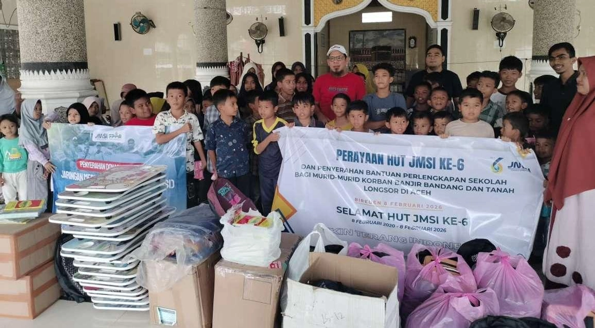 Jaringan Media Siber Indonesia (JMSI) Aceh memperingati ulang tahun ke-6 dengan acara yang berlangsung di Meunasah Kubu Siblah Krueng, Peusangan Bireuen, Minggu (8/2/2026). Acara ini dirangkai dengan penyerahan donasi berupa perlengkapan sholat, tas sekolah, buku, dan meja kecil untuk belajar para murid.