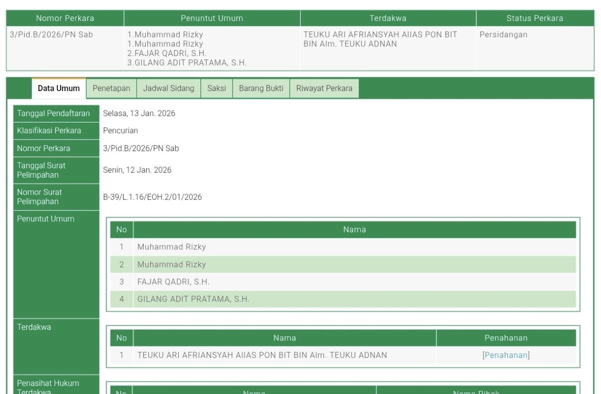 Ketua Kamar Dagang dan Industri (Kadin) Kota Sabang, Teuku Ari Afriansyah alias Pon Bit, didakwa melakukan pencurian dengan pemberatan setelah diduga membobol brankas dan merusak ruang manajer dan bendahara SPBU yang masih disewa PT Quilla Alulase. Peristiwa ini terjadi pada Jumat, 20 Juni 2025 sekitar pukul 21.00 WIB di area SPBU Nomor 14.235.465 yang beralamat di Jalan T. Nyak Arief, Gampong Ie Meulee, Kecamatan Sukajaya, Kota Sabang.