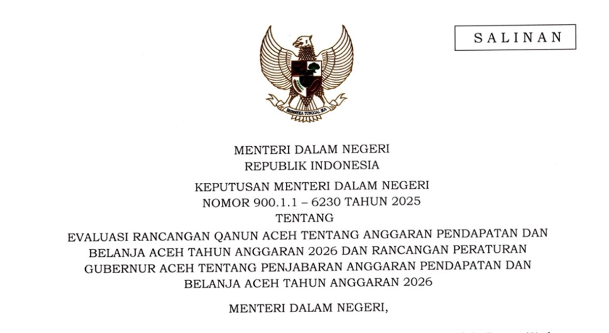 Gubernur Aceh diminta untuk menyampaikan kembali Raqan Aceh tentang APBA TA 2026 dan Rancangan Peraturan Gubernur Aceh tentang Penjabaran APBA TA 2026 yang telah dilakukan penyempurnaan dan penyesuaian sesuai dengan hasil evaluasi kepada Mendagri untuk mendapatkan nomor register.