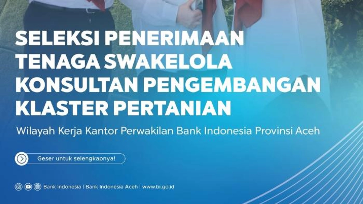 Rekrutmen ini diperuntukkan bagi posisi Konsultan Pengembangan Klaster Pertanian dengan penempatan di Kantor Perwakilan Bank Indonesia Provinsi Aceh.