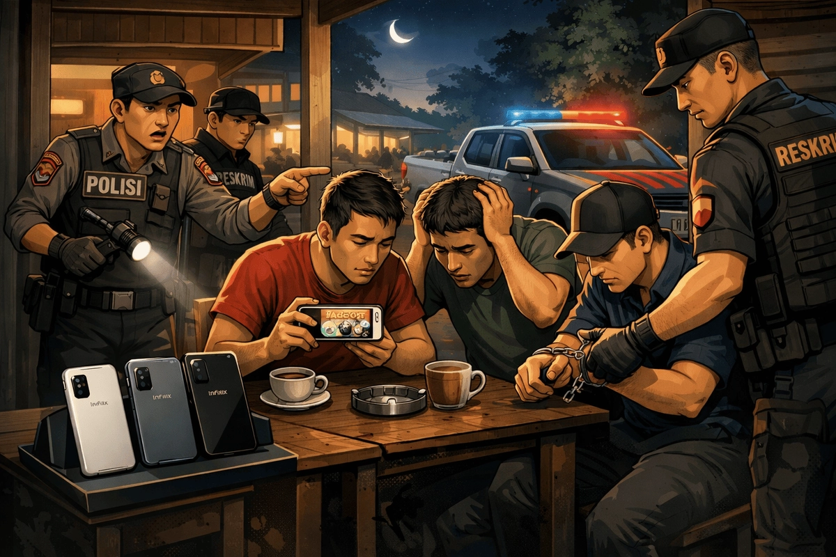 Polisi Nagan Raya mengamankan tiga pemuda yang tertangkap bermain judi online jenis slot di sebuah warung kopi di Desa Blang Teungoh, Kecamatan Kuala. Ketiga pelaku, yang berinisial S, H, dan J, mengaku melakukan perbuatan tersebut dan barang bukti berupa tiga unit telepon genggam diamankan.