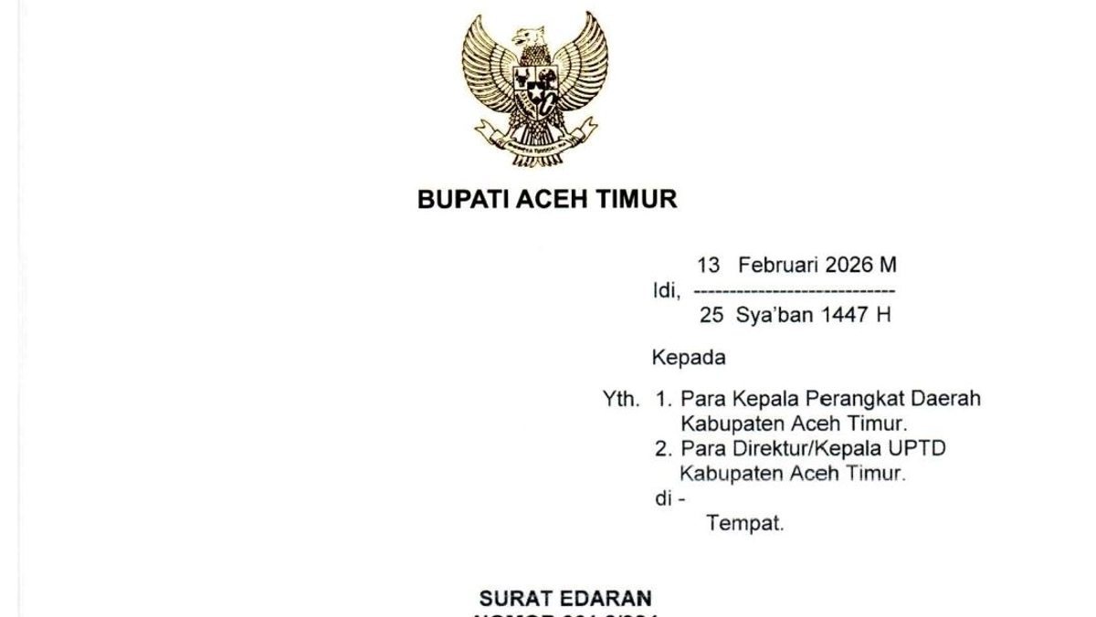 Pemerintah Kabupaten Aceh Timur resmi menyesuaikan jam kerja bagi Aparatur Sipil Negara (ASN) selama bulan suci Ramadhan 1447 H. Kebijakan ini dituangkan dalam Surat Edaran Bupati Aceh Timur Nomor 061.2/904 dan bertujuan untuk memberikan kelancaran bagi ASN dalam menjalankan ibadah puasa, sekaligus memastikan produktivitas kerja dan pelayanan publik tetap optimal.