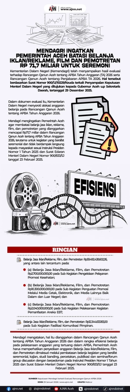 Pemerintah Aceh diingatkan oleh Menteri Dalam Negeri untuk membatasi belanja iklan, film, dan pemotretan sebesar Rp 71,7 miliar yang dialokasikan untuk seremonial. Ini dilakukan untuk mengoptimalkan penggunaan anggaran daerah dan memastikan kejelasan dalam pengelolaan keuangan.