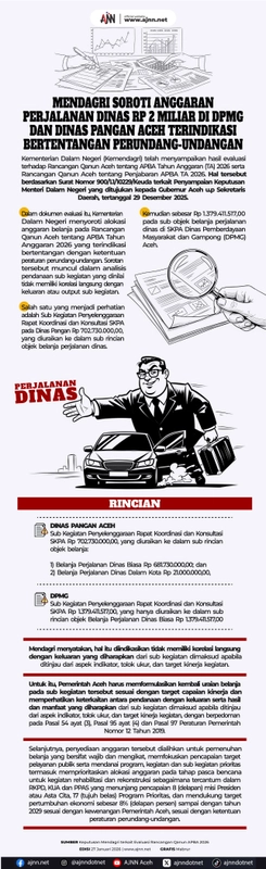 Mendagri menyoroti anggaran perjalanan dinas sebesar Rp 2 miliar di DPMG dan Dinas Pangan Aceh yang terindikasi bertentangan dengan perundang-undangan. Ini menimbulkan kekhawatiran tentang transparansi dan penggunaan anggaran pemerintah. Dampaknya dapat mempengaruhi kepercayaan masyarakat terhadap pengelolaan keuangan daerah. Kasus ini juga mengungkapkan potensi masalah dalam pengawasan anggaran di Aceh.
