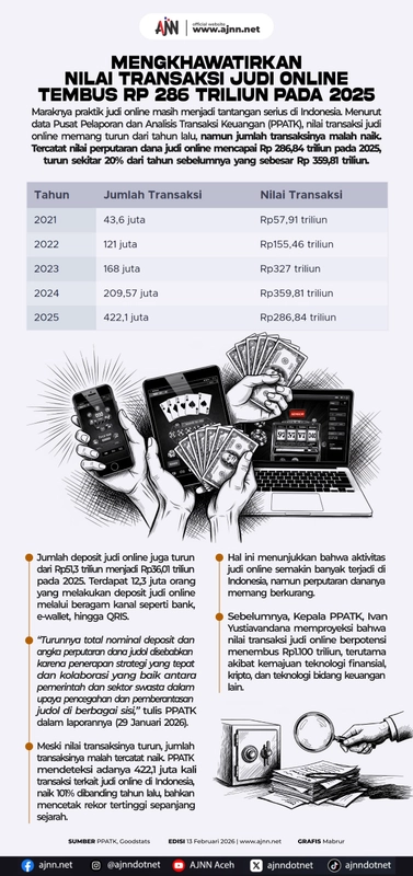 Nilai transaksi judi online di Aceh dijangka akan mencapai Rp 286 triliun pada 2025. Ini mengkhawatirkan karena dampaknya pada stabilitas sosial dan ekonomi daerah. Pemerintah setempat perlu mengambil langkah tegas untuk mengatasi masalah ini.