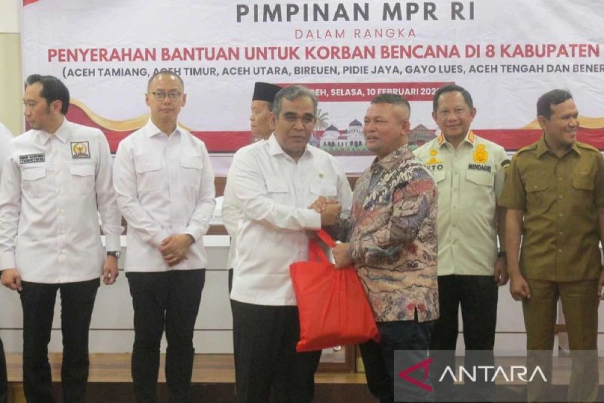 Pimpinan Majelis Permusyawaratan Rakyat (MPR) RI menyalurkan bantuan berupa 30 ribu paket kepada masyarakat terdampak bencana hidrometeorologi di delapan kabupaten di Provinsi Aceh. Bantuan tersebut diserahkan Ketua MPR RI Ahmad Muzani kepada para bupati maupun wakil bupati dari delapan kabupaten terdampak bencana hidrometeorologi di Kantor Gubernur Aceh di Banda Aceh, Selasa.