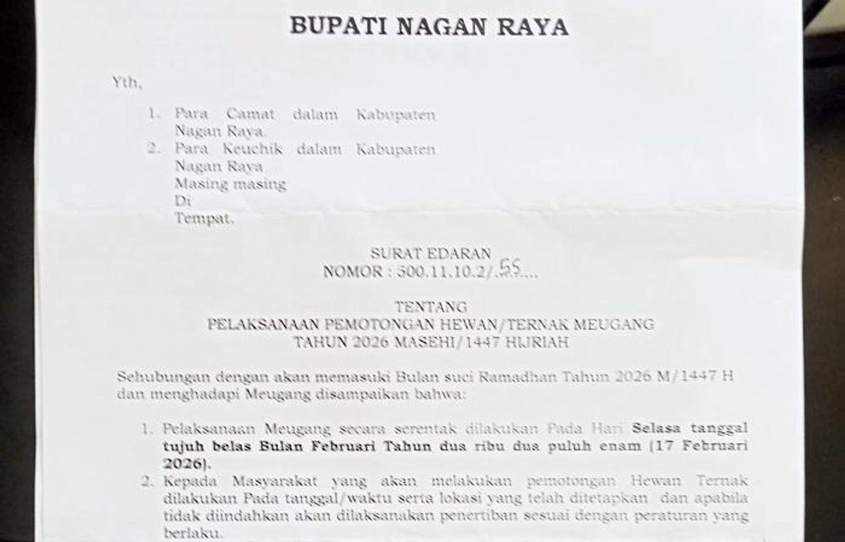 Pemkab Nagan Raya telah menetapkan hari penjualan daging meugang untuk Ramadhan 2026 pada Selasa 17 Februari. Penjualan akan dilakukan serentak di semua titik di Nagan Raya, sesuai dengan surat edaran Bupati Nagan Raya yang ditujukan ke camat dan keuchik se-Nagan Raya.