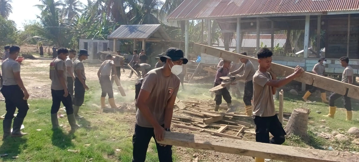 Personel Polres Lhokseumawe melaksanakan kegiatan gotong royong pembersihan Balai Pengajian Darul Ilmi di Desa Teumpok Berandang, Kecamatan Muara Batu, Kabupaten Aceh Utara, Sabtu (31/1/2026). Ini sebagai bentuk kepedulian terhadap fasilitas keagamaan pascabanjir yang terjadi di wilayah tersebut pada 26 November 2025 lalu.