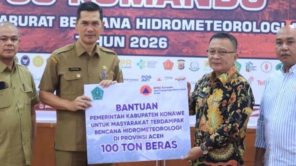 Pemerintah Kabupaten (Pemkab) Konawe, Provinsi Sulawesi Tenggara, menyalurkan bantuan kemanusiaan berupa 100 ton beras untuk membantu masyarakat Aceh yang terdampak bencana banjir dan tanah longsor. Bantuan tersebut diserahkan secara simbolis oleh Wakil Bupati Konawe, Syamsul Ibrahim, kepada Sekretaris Daerah (Sekda) Aceh, M. Nasir, di Posko Penanganan Bencana Pemerintah Aceh, Selasa (27/1/2026).
