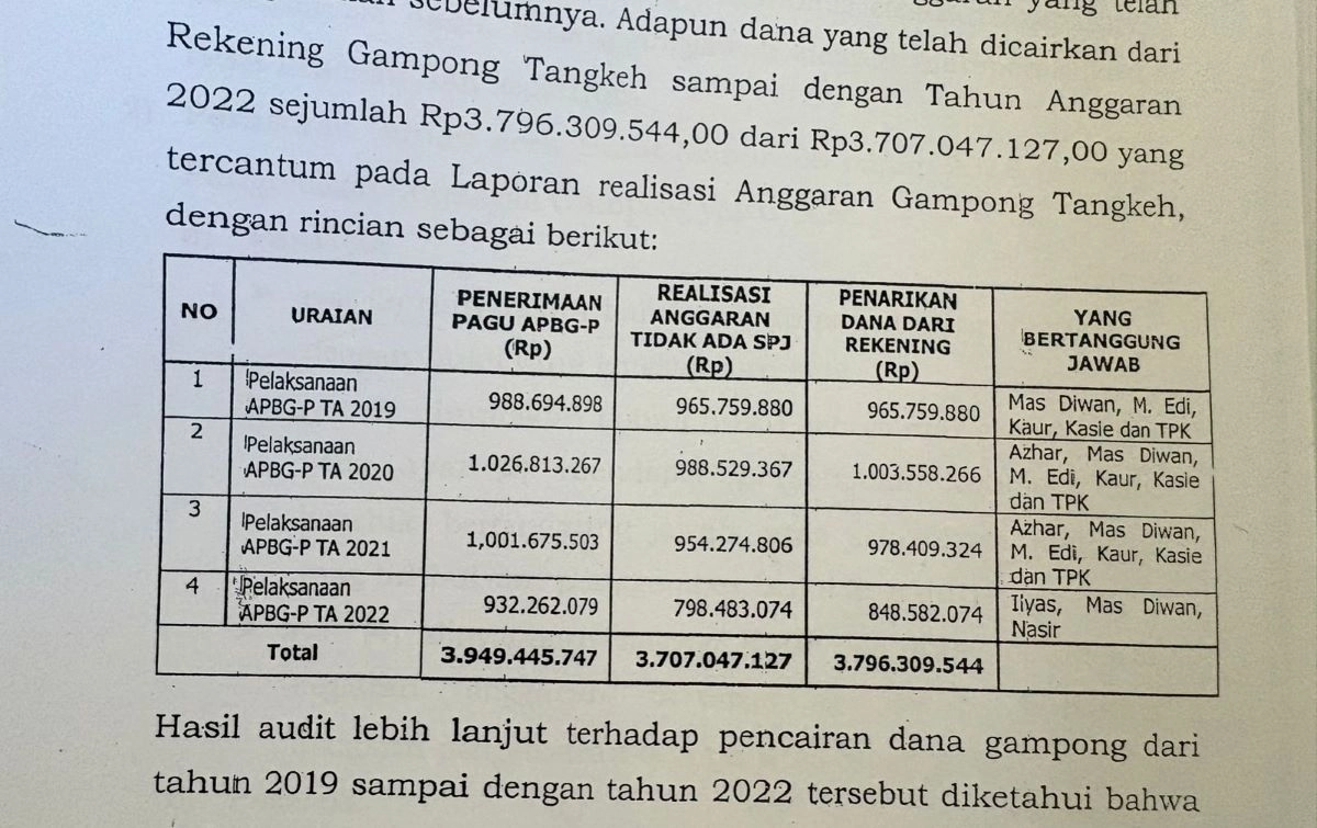 Inspektorat Aceh Barat menemukan adanya penarikan dan realisasi Anggaran Pendapatan dan Belanja Gampong (APBG) tanpa Surat Pertanggungjawaban (SPJ) pelaksanaan kegiatan dalam jangka empat tahun, yaitu dari 2019-2022. Temuan tersebut tertuang dalam Laporan Hasil Audit Operasional (LHAO) terhadap pengelolaan APBG Tangkeh, Kecamatan Woyla Timur, tahun anggaran 2019 sampai dengan 2022, Nomor 700/7/LHAOG-INS/IV/2024.