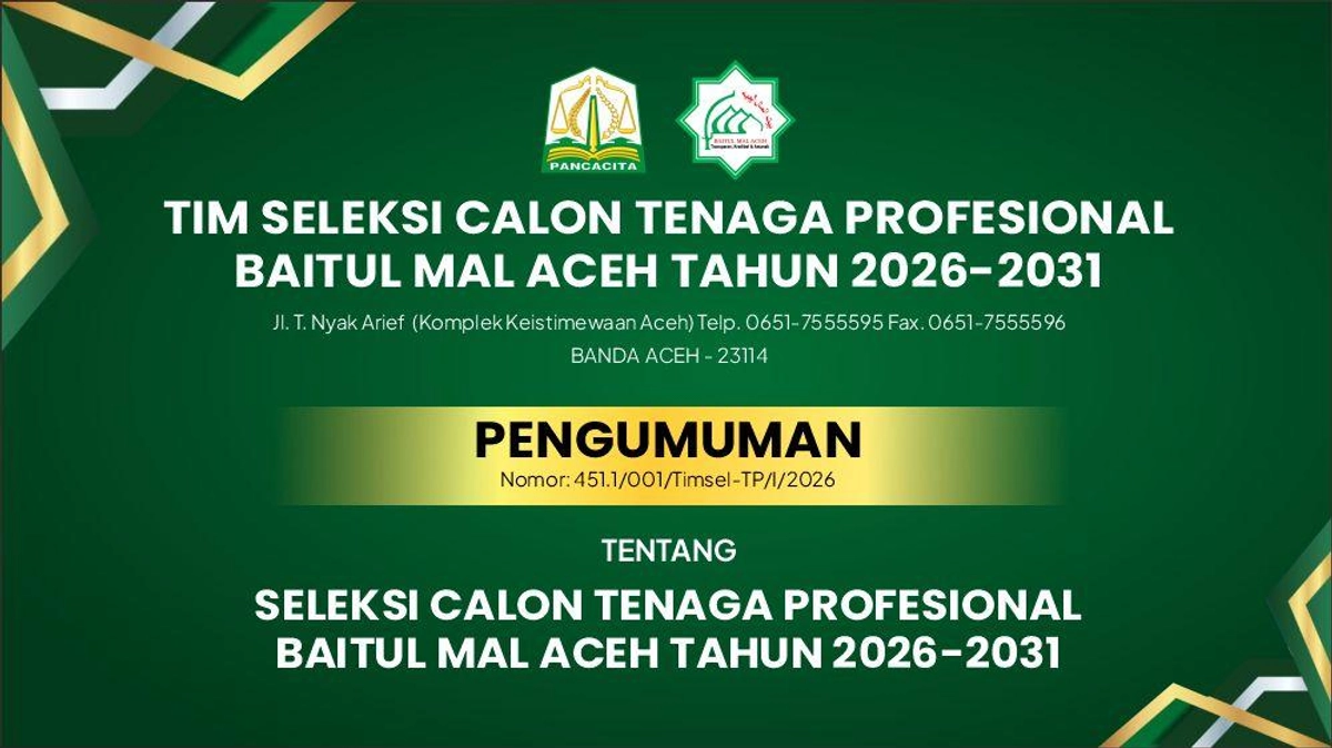 Pemerintah Aceh melalui Baitul Mal Aceh membuka kesempatan bagi masyarakat untuk mendaftar sebagai calon tenaga profesional untuk periode 2026-2031. Pendaftaran dapat dilakukan melalui link resmi yang telah disediakan, dan informasi lebih lanjut dapat diakses melalui website Baitul Mal Aceh.