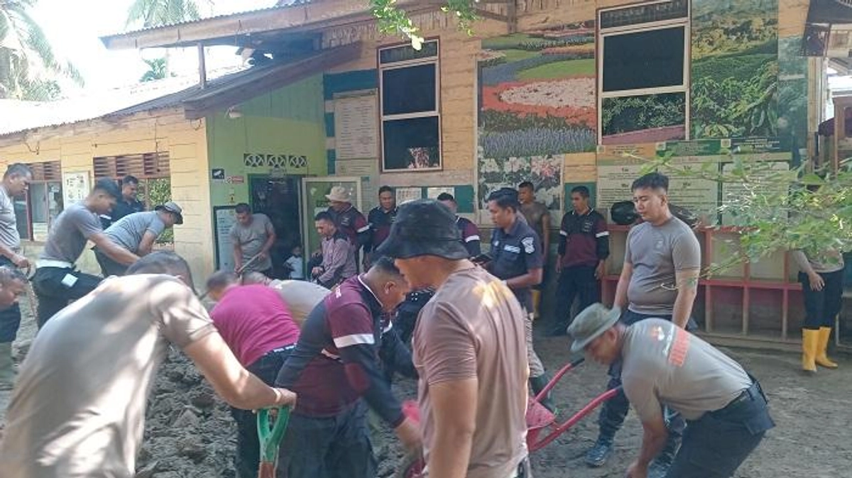 Dengan peralatan sederhana, para personel Polri bekerja tanpa mengenal lelah, menyisir setiap sudut halaman sekolah yang tertutup lumpur tebal. Tujuan kegiatan ini bukan hanya menjaga kebersihan lingkungan pendidikan, tetapi juga membantu masyarakat bangkit dari dampak bencana. Lingkungan belajar yang bersih dan aman diharapkan mampu memulihkan semangat anak-anak agar tetap ceria dan siap menatap masa depan.