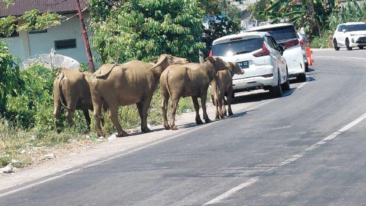 - Kerbau yang lepas dapat membahayakan pengendara.