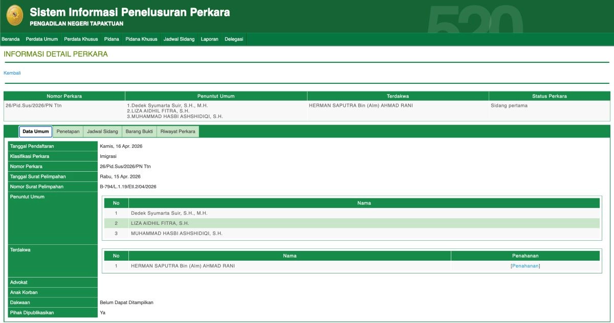 - Lokasi Sidang: Ruang Sidang Cakra, Pengadilan Negeri Tapaktuan