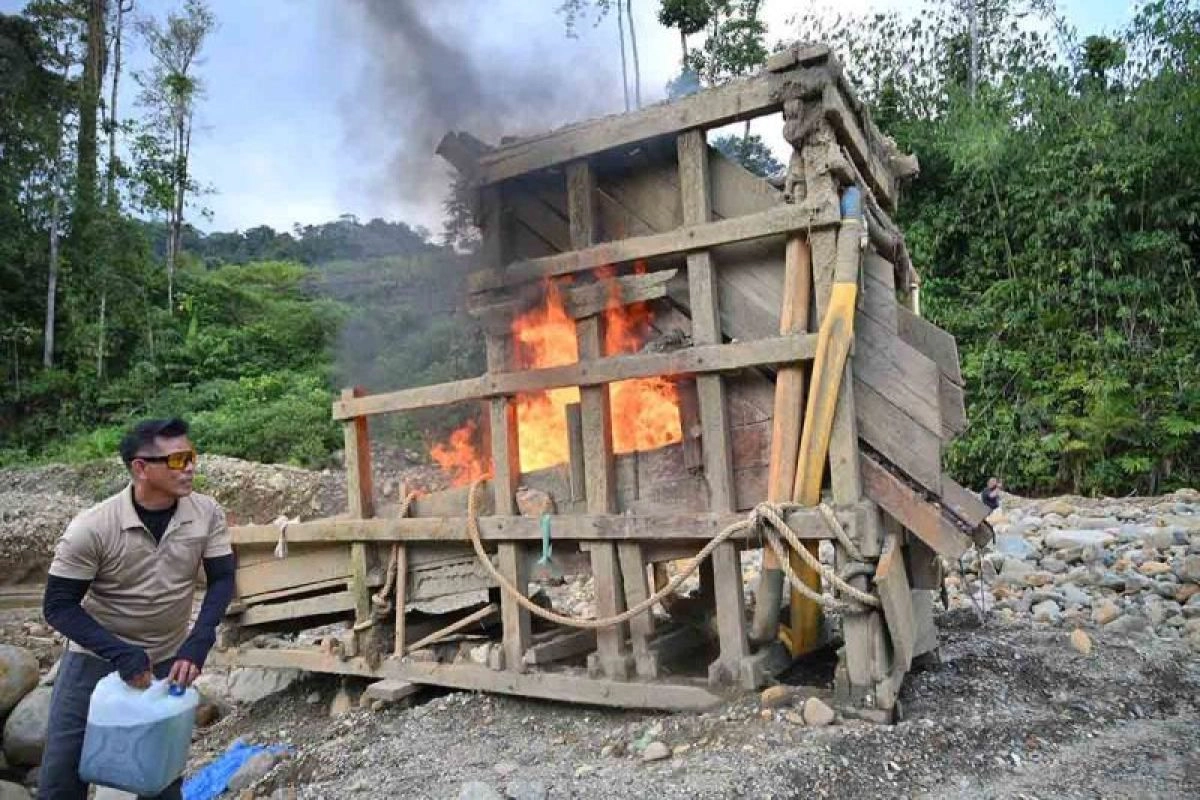 - Tim gabungan Polri dan TNI memasang tanda dilarang masuk dan larangan tambang serta membakar alat penambang yang ditinggalkan, termasuk dua penyaring emas dari kayu dan dua kandang penampungan.