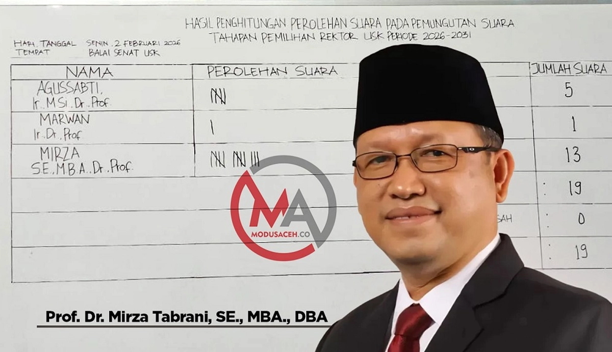 Prof Mirza Tabrani terpilih sebagai Rektor Universitas Syiah Kuala (USK) dalam Rapat Pleno Tertutup Majelis Wali Amanat (MWA) yang digelar di Balai Senat USK, Darussalam, Banda Aceh, Senin. Dalam pemungutan suara, Prof Mirza meraih 13 suara, unggul jauh dibandingkan Prof Dr Ir Agussabti MSi yang memperoleh 5 suara, serta Prof Dr Ir Marwan yang meraih 1 suara.