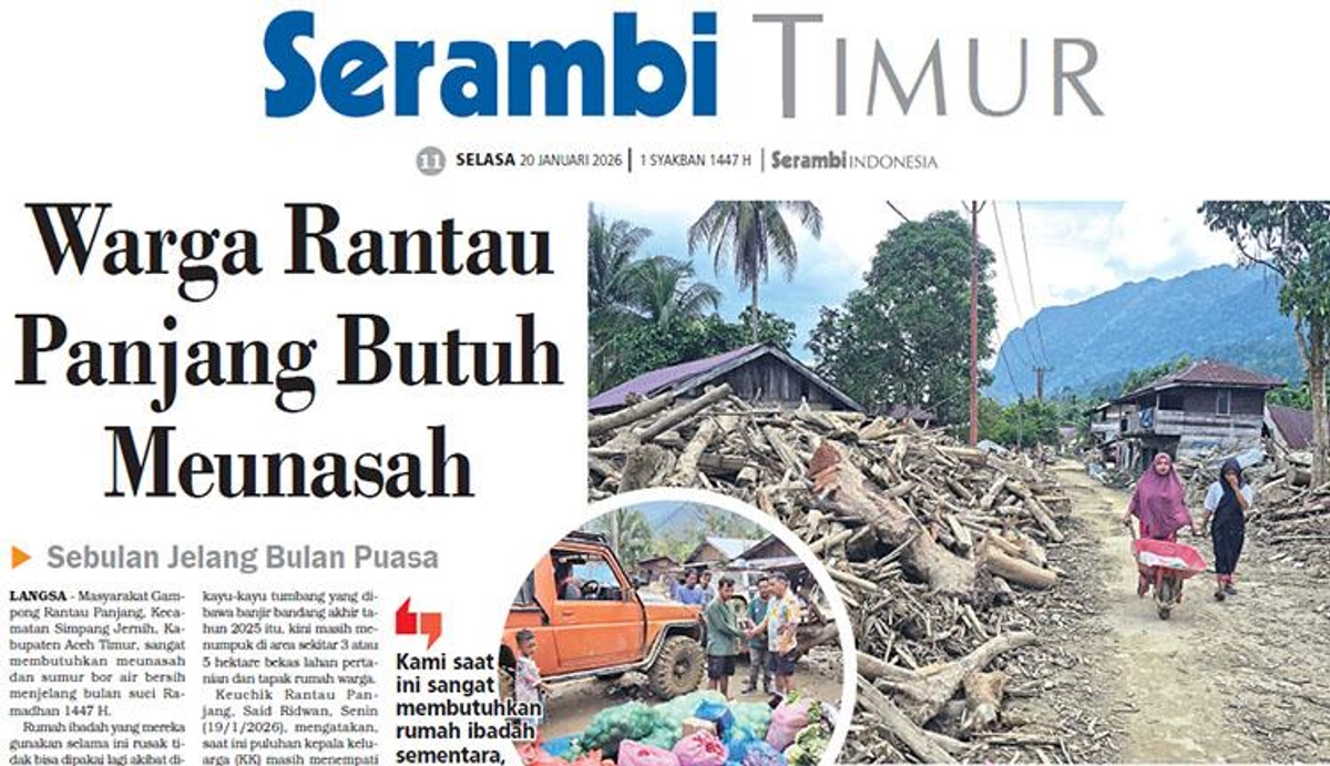 Warga Gampong Rantau Panjang, Kecamatan Simpang Jernih, Kabupaten Aceh Timur, sedang menghadapi kesulitan menjelang bulan suci Ramadhan. Banjir yang melanda akhir tahun 2025 telah merusak mushala yang digunakan sebagai tempat ibadah, serta pipa air yang menyediakan air bersih bagi warga. Saat ini, warga terpaksa tinggal di tenda darurat dan kesulitan mendapatkan air bersih.