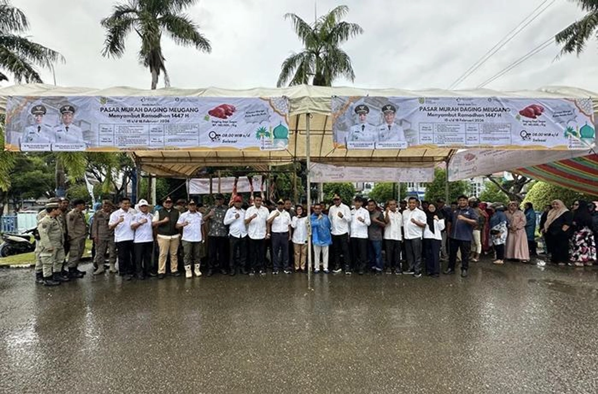 Sekretaris Daerah Kota Banda Aceh, Jalaluddin, melakukan peninjauan Pasar Murah Daging Meugang pada hari terakhir pelaksanaannya di Halaman Kantor PDAM Tirta Daroy, Rabu (18/2/2026). Pemerintah Kota Banda Aceh melakukan intervensi pasar untuk mengontrol harga daging, sehingga masyarakat kurang mampu tetap dapat menikmati daging dengan harga terjangkau dan menjaga daya beli masyarakat sekaligus mengendalikan inflasi di Kota Banda Aceh.