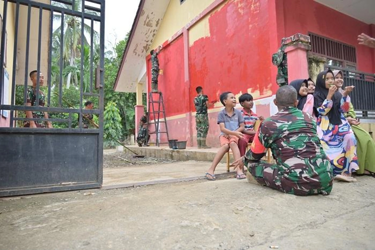 Personel TNI AD dari Kodim 0102/Pidie bersama Batalyon Infanteri Teritorial Pembangunan 836/Brahma Yodha (Yonif TP 836/BY) melakukan karya bakti pengecatan tujuh sekolah/madrasah di Pidie Jaya (Pijay), Kamis (12/2/2026). Pengecatan dengan warna merah putih dimaksudkan untuk menghadirkan simbol kebangsaan sebagai pembangkit rasa nasionalisme dan wujud nyata kepedulian TNI terhadap dunia pendidikan pascabencana.