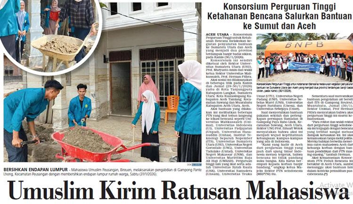 Universitas Almuslim (Umuslim) Peusangan, Bireuen, secara resmi mengirim 250 mahasiswa untuk melaksanakan pengabdian ke gampong terdampak banjir bandang di tiga kecamatan. Mahasiswa akan ditempatkan di Gampong Pante Baro Gle Siblah, Kecamatan Peusangan Siblah Krueng, Desa Tanjong Nie dan Pante Lhong, Kecamatan Peusangan, serta Gampong Cot Ara, Kecamatan Kutablang Blang. Mereka akan berperan sebagai pendamping masyarakat, fasilitator kegiatan, serta penggerak inovasi berbasis kebutuhan lokal.