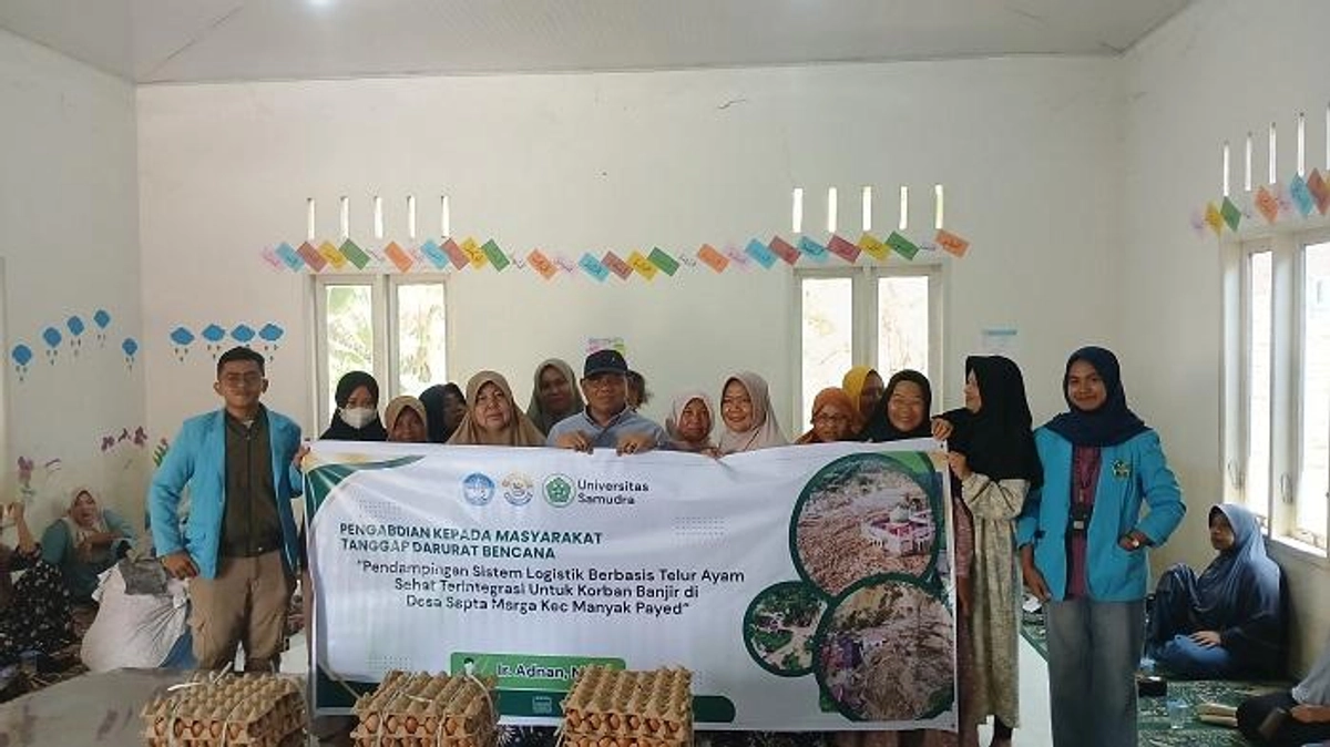 Banjir yang melanda Desa Sapta Marga, Kecamatan Manyak Payed, Aceh Tamiang, menyebabkan lumpuhnya akses logistik dan menurunnya ketersediaan pangan. Universitas Samudra (Unsam) melalui program Pendampingan Sistem Logistik Berbasis Telur Ayam Sehat Terintegrasi berupaya membantu korban banjir dengan menyediakan telur ayam sehat sebagai sumber protein yang mudah diakses dan bergizi.