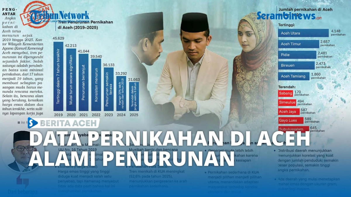 Angka pernikahan di Aceh terus menurun dalam enam tahun terakhir. Data dari Kantor Wilayah Kementerian Agama Aceh menunjukkan bahwa pada tahun 2025, hanya 31.663 pernikahan yang tercatat, turun dari 33.292 pernikahan di tahun 2024. Penurunan ini berlangsung sejak tahun 2019 yang mencatat angka tertinggi sebesar 45.629 pernikahan.