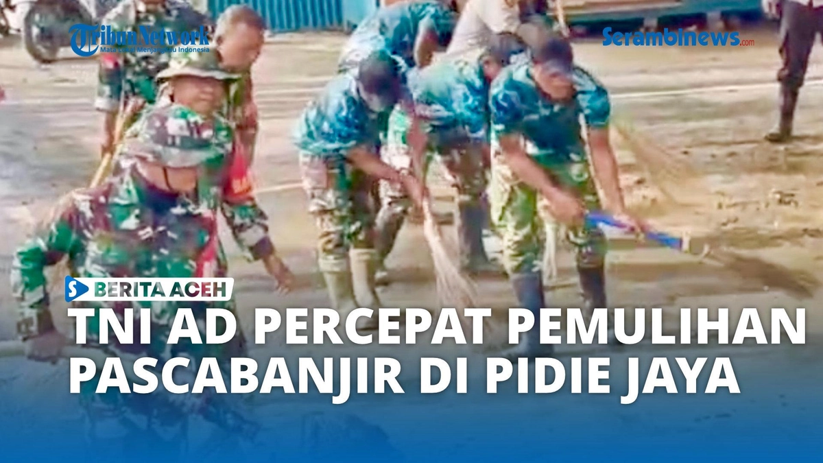 Personel TNI Angkatan Darat yang tergabung dalam Satuan Tugas Penanggulangan Bencana Alam membersihkan jalan utama di Kota Meureudue, Kabupaten Pidie Jaya. Kegiatan ini menyasar debu, sampah, dan sisa material banjir di sepanjang jalur utama kota.